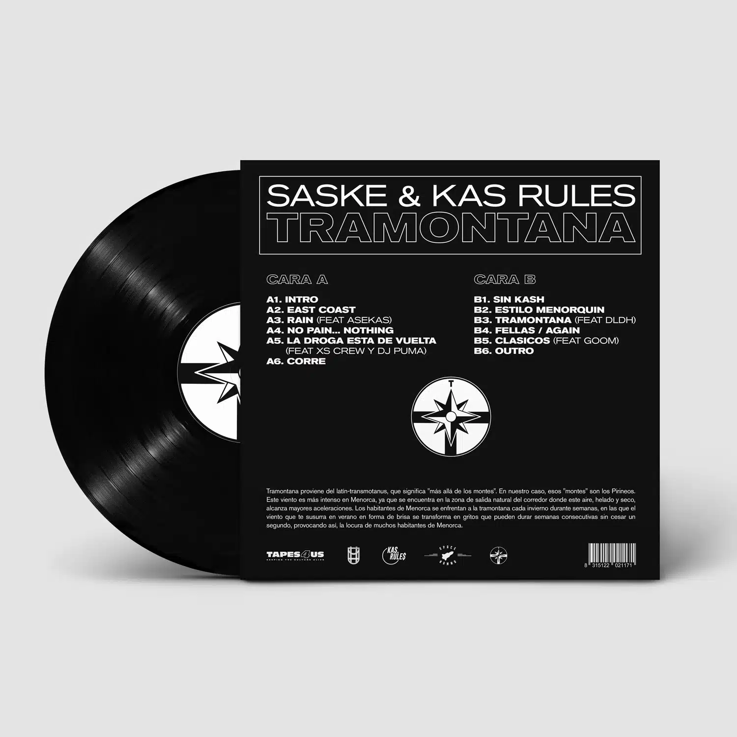 TAPES4US RECORDS presenta en exclusiva Tramontana, de Saske y Kas Rules (Space Hamurabi). Prepárate para crujirte el cuello con este álbum de puro boom bap: con los ritmos gruesos de Kas, reventando bombos y cajas por doquier y las rimas afiladas de Saske, ingeniosas y con muchísimo caracter, harán que que te levantes de la mesa al escuchar este álbum.